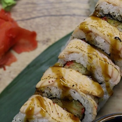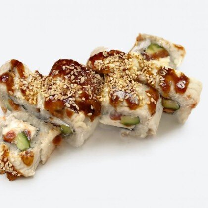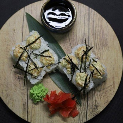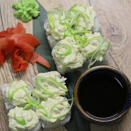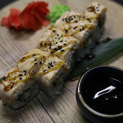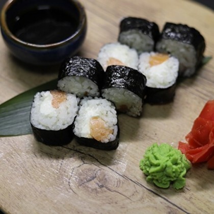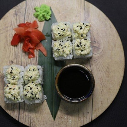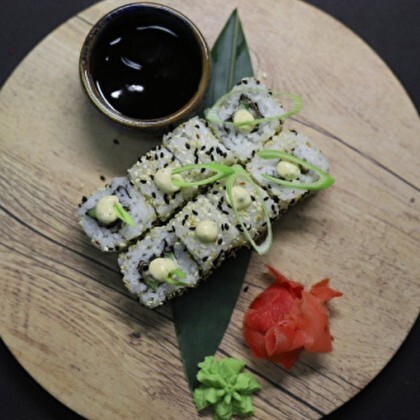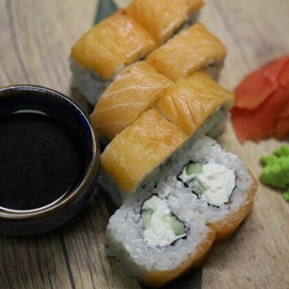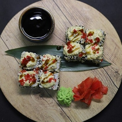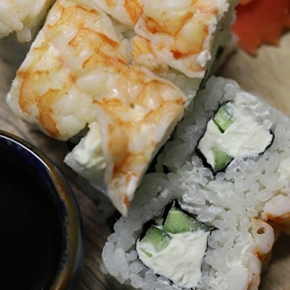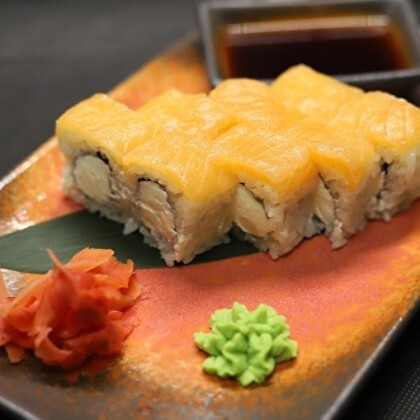 Рис, лосось, сыр, краб, креветка, огурец, масаго.